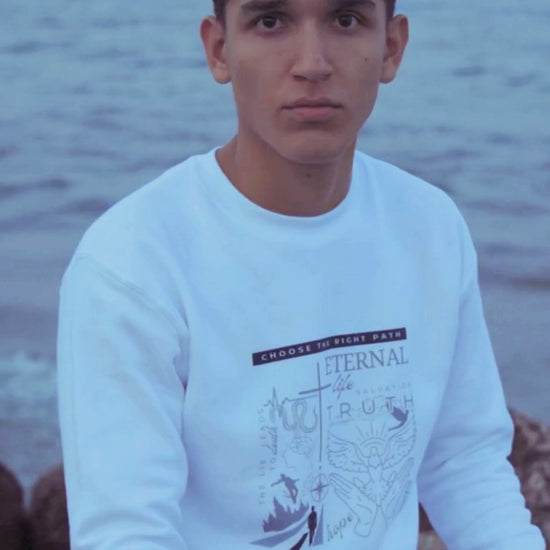 In a world of many paths, choose the one that leads to salvation. With this special sweatshirt that separates the kingdom of light from that of darkness in a line art collage design, you will make a difference in someone´s life and remind them to walk the right path. The perfect combination of style, a profound message, and a comfortable fit with soft fleece inside, ideal for colder days.