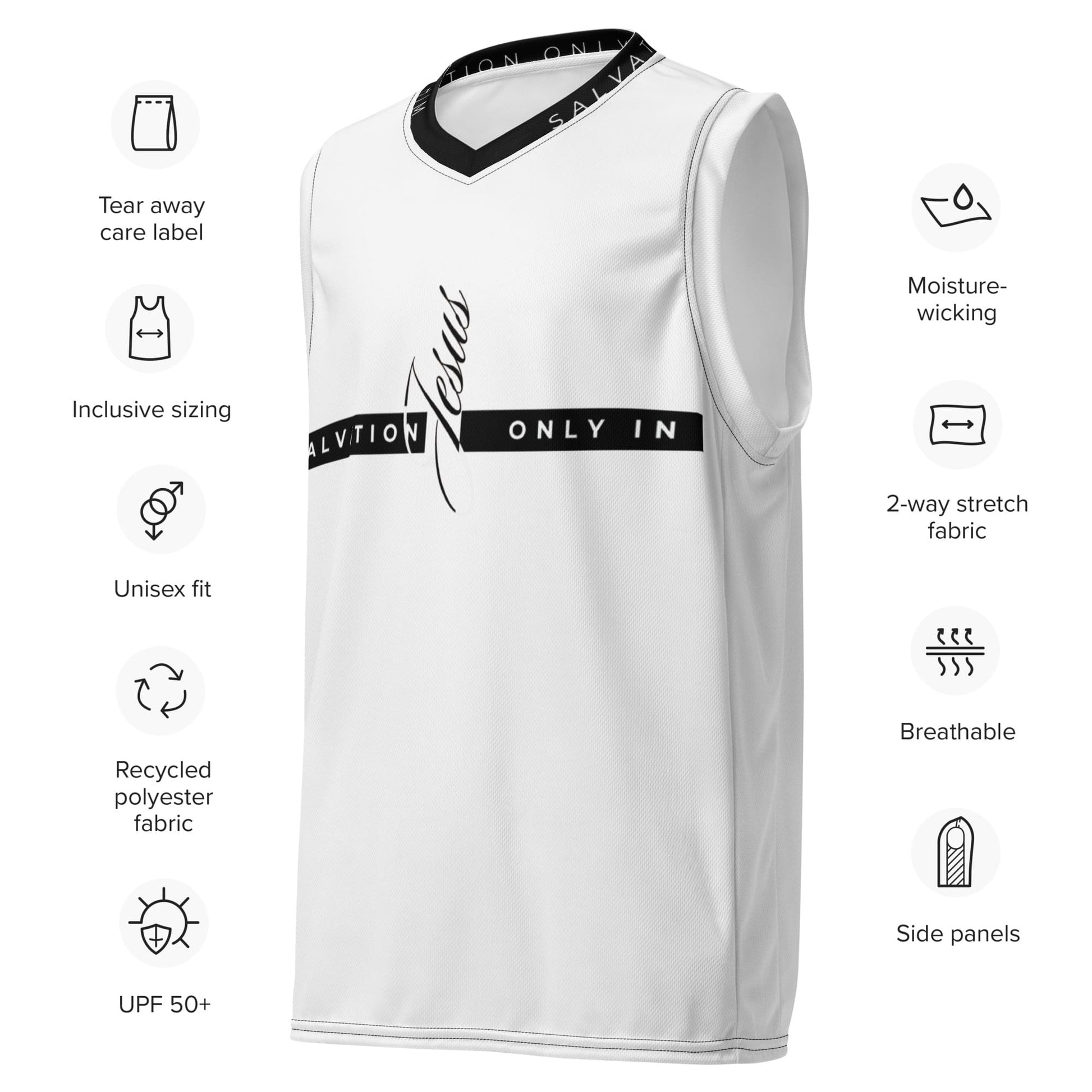 Looking for Christian fitness apparel that will carry the gospel to your favourite sport? Look no further! Whether you are working out in the gym, outdoors or playing basketball, our Salvation Only In Jesus sports jersey has got you covered. Made with recycled polyester fabric, this jersey is not only eco-friendly but designed to keep you cool and dry even in the heat of competition.