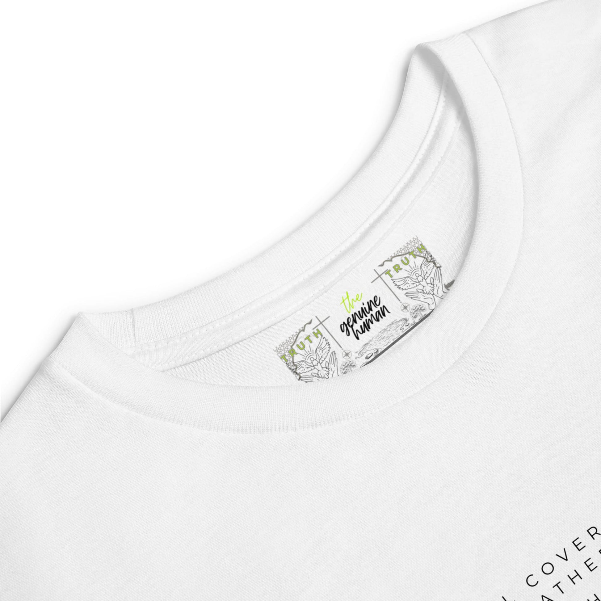 This cute long sleeve shirt illustrates the protective power of God, featuring a little angel looking up to the golden wings around it and the words of Psalm 91:4: "He will cover you with his feathers, and under his wings you will find refuge".